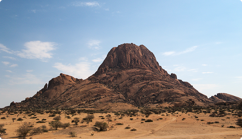 Situated in an endless, dry plain, the island of mountains can be seen from far away. The difference in altitude between the mountain peak and the surrounding plains measures 700 Meter. Next to the Spitzkoppe is the "Small Spitzkoppe" with a height of 1584 metres above sea level and next to it the Pontok Mountains.